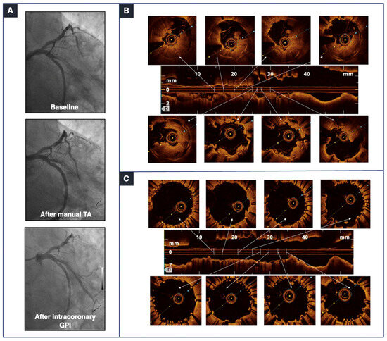 Severely calcified coronary lesions are common among patients undergoing PCI, accounting for up to one-fourth of subjects presenting with ACS [1,2,3]. Treatment of these high-risk lesions still represents a clinical conundrum for interventional cardiologists due to the difficulty of wiring the occlusions and achieving optimal angiographic results following stent implantation. Large calcium deposits may hinder stent expansion and apposition, trigger damage to drug-eluting polymers, and hamper drug delivery and diffusion throughout the stent–vessel interface [4,5]. These effects could ultimately prompt periprocedural complications and long-term stent failure due to stent malapposition or underexpansion, with a consequent high risk of in-stent restenosis (ISR) or stent thrombosis (ST). Morphologic characterization of coronary artery calcification (CAC) by angiography alone is limited and needs to be complemented by intravascular imaging techniques such as intravascular ultrasound (IVUS) or optical coherence tomography (OCT) to allow optimal PCI planning [6,7,8].