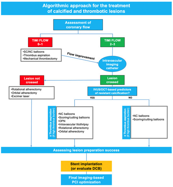 An algorithmic approach to the treatment of calcified and thrombotic lesions. Abbreviations: DCB: drug-coated balloon; NC: non-compliant; SC: semi-compliant; OPN: high-pressure balloons.