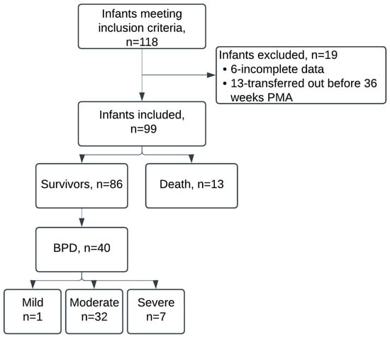 This single-center retrospective observational study took place at BCWH, a quaternary-perinatal center in Canada. We included preterm inborn and outborn infants born at less than 29 weeks gestational age who were admitted to the NICU between March 2022 and August 2023. We excluded infants who had major congenital anomalies and those transferred to other units before reaching 36 weeks postmenstrual age (PMA). The NICU admission register was initially used to identify infants eligible for the study. Demographic and respiratory support data necessary for inputting into the NICHD BPD outcome estimator 2022 tool were collected from the hospital’s electronic health records (EHR). The CNN database, housed at BCWH, provided BPD, mortality, and resource utilization data. We estimated the risk of BPD (Grade 1, 2, and 3) and mortality using the NICHD BPD outcome estimator 2022 for the days 1, 3, 7, 14, and 28. We followed these selected time points in our study to ensure consistency with the validated NICHD 2022 online BPD outcome estimator tool. Whenever there was a doubt in ascertainment of BPD in the CNN database, e.g., nasal cannula flow rate, we reviewed the infant EHR to ensure accuracy in capturing observed outcomes. There were no major practice changes to alter BPD during the study period. We used oxygen saturation targets of 88 to 92%, minimally invasive surfactant treatment, and approved postnatal steroids such as systemic hydrocortisone to prevent BPD (STOP-BPD) [], The Dexamethasone- A randomized trial (DART) [], and inhaled budesonide regimens [,]. No postnatal steroid guidelines existed, and care teams decided by consensus.