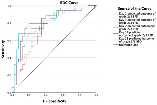 We used the definitions of the NICHD BPD outcome estimator 2022 while interpreting the output, i.e., at 36 weeks PMA, Grade 1 BPD if requires 2 L/min nasal cannula or less, Grade 2 if requires more than 2 L/min nasal cannula or other forms of non-invasive ventilation support, and Grade 3 if requires invasive mechanical ventilation [,]. We used the observed severity of BPD using CNN database definition. At 36 weeks PMA, mild BPD if receives nasal cannula with 100% oxygen of <100 mL/min or 21–99% blended air/oxygen with flow rate of 1.5 L/min or less; moderate BPD if receives nasal cannula of 21–29% blended air/oxygen of 1.5 L/min or more, or 21–29% blended air/oxygen with continuous positive airway pressure (CPAP), synchronized positive airway pressure (SIPAP), non-invasive positive pressure ventilation (NIPPV) or non-invasive high frequency ventilation (NIHFV); severe BPD if 30% or more oxygen with nasal cannula of > 1.5 L/min or 30% of more of oxygen with CPAP, SIPAP, NIPPV, NIHFV or intubation and ventilation []. We validated the NICHD 2022 BPD outcome estimator using the CNN definition that’s already used in our unit. We believed that such alignment would facilitate local clinicians’ support for the tool’s adoption in clinical practice. To facilitate analysis of observed versus estimated outcomes, we classified infants into risk categories at time points day 1, 3, 7, 14, and 28, with an estimated risk of <10, 10–19, 20–29, 30–39, 40–49, 50–59%, and ≥60% from the NICHD BPD outcome estimator 2022. Next, we calculated the number of infants with the observed outcomes. We compared the estimator’s predicted probabilities with the observed outcomes. The unavailability of pre-study EHR data at our center hindered the collection of the NICHD’s BPD outcome estimator 2022 input variables, so we chose a convenience sample size. There was limited time available for validation prior to initiation of BPD prevention-related QI interventions locally. We used descriptive statistics to summarize baseline characteristics and NICU interventions. For infants who died before reaching 36 weeks PMA, and outborn infants with missing data for specific days before their admission to the NICU, we included them in the analysis on time points when their data were available. We generated receiver operating characteristic (ROC) curves to evaluate the predictive validity of the NICHD BPD outcome estimator 2022 at each time point. Using SPSS (Released 2023. IBM SPSS Statistics for Macintosh, Version 29.0.2.0 Armonk, NY, USA: IBM Corp.), we calculated the area under the curve (AUC) values. We selected an AUC greater than 0.7 for each ROC curve as the minimal acceptable predictive accuracy for local adoption of the BPD estimator tool []. This threshold denotes significant predictive accuracy. The hospital’s research ethics board approved the study (H24-00785).
