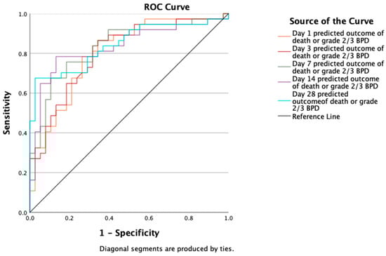 The following supporting information can be downloaded at: https://www.mdpi.com/article/10.3390/jcm14030696/s1, Table S1: Interventions received during NICU stay; Table S2: Duration of interventions received during NICU stay; Table S3: Comparison of ROC curve across days 1, 3, 7, 14, and 28.