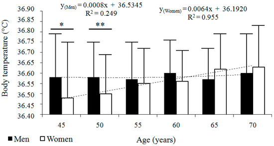 Longitudinal changes in body temperature (°C) across six consecutive age categories in men (n = 68) and women (n = 74). Data are presented as arithmetic means ± standard deviations (SD), accompanied by regression models and their corresponding coefficients of determination (R2). * p ≤ 0.05, ** p ≤ 0.01, differences between sexes compared with Student’s t-test.