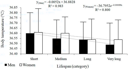 The cross-sectional analysis showed that body temperature decreased with advancing age in both sexes (Figure 2, Table 3). Lower age at death was generally associated with higher body temperature, while higher at death corresponded to lower body temperature. The best-fitted regression model was linear in men (y = −0.0052x + 36.8828; R2 = 0.983) and exponential in women (y = −36.7952e−0.00009x; R2 = 0.8).
