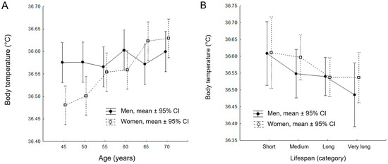 Several potential mechanisms may explain these findings. For example, chronic low-grade systemic inflammation (CLSI, also referred to as inflammaging), which has recently been recognized as one of the hallmarks of aging, can contribute to elevated body temperature and reduced longevity [21,22]. Furthermore, age-related conditions such as insulin resistance, type 2 diabetes, and autoimmune diseases, all of which drive CLSI, might also be involved in comorbidities [23]. In general, women are more susceptible to autoimmune disorders than men [24,25]. In this study, women had significantly higher body mass index (BMI) than men [26]. It is well-established that high BMI is linked not only to increased mortality but also to elevated white blood cell (WBC) counts, both of which correlate with reduced longevity [27,28].