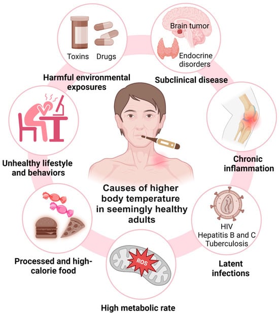 Research indicates that a lower core body temperature might serve as a biomarker of longevity, influenced by various factors affecting both thermoregulation and survival (Figure 4). These factors include the following: (1) the absence of subclinical conditions, such as brain tumors or hyperthyroidism, (2) a reduced risk of CLSI associated with conditions like insulin resistance, type 2 diabetes mellitus, and autoimmune disorders, which can impair health and longevity [23], (3) the absence of latent infections such as tuberculosis, human immunodeficiency viruses (HIV), and hepatitis B and C, which can elevate body temperature and increase the risk of premature death [29,30,31], (4) a lower metabolic rate, which is linked to reduced molecular and cellular damage due to decreased reactive oxygen species (ROS) production—a benefit potentially enhanced by limited caloric intake, which is also associated with lower body temperature and may promote longevity [8,32], (5) the avoidance of unhealthy lifestyle factors, including chronic psychological stress, sleep deprivation, physical inactivity (sedentarism), high-calorie diets, and increased body fatness (e.g., obesity), which can raise the body’s core temperature and concurrently reduce long-term survival [33,34,35,36], and (6) minimizing prolonged exposure to harmful environmental factors such as high ambient temperatures or toxins [37,38,39].