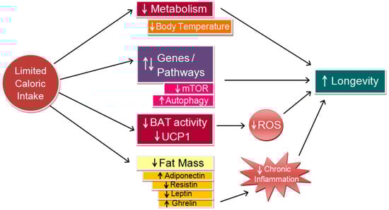 Conceptual model linking caloric restriction (CR) to longevity (adapted from [8], modified). CR lowers metabolic rate, which in turn decreases body temperature and mitigates molecular and cellular damage. This reduction curtails the production of reactive oxygen species (ROS), thereby decreasing oxidative stress. Collectively, these effects can promote health and longevity through mechanisms such as mTOR inhibition and autophagy enhancement. Additionally, they alleviate chronic systemic inflammation, further contributing to increased longevity. BAT = brown adipose tissue; UCP1 = uncoupling protein one.