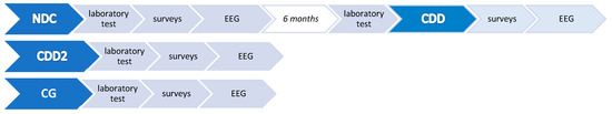 Study protocol, divided by groups and study stages. Definition of abbreviations: NDC = a newly diagnosed celiac group, CDD = celiac disease on diet group, CDD2 = celiac disease on diet for more than 12 months group, CG = comparison group, EEG = electroencephalography.