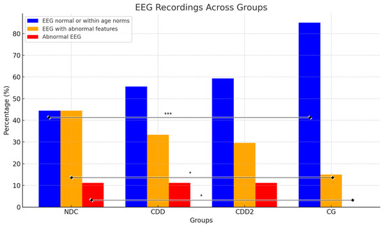 Qualitative assessment of EEG recordings in patients with celiac disease. A significant difference was observed between the NDC and CG groups for EEG recordings with normal (p < 0.001 ***), EEG with abnormal features (p = 0.017 *), and abnormal EEG (p = 0.032 *). Definition of abbreviations: NDC = a newly diagnosed celiac group, CDD = celiac disease on diet group, CDD2 = celiac disease on diet for more than 12 months group, CG = comparison group. Levels of significance: * p < 0.05, *** p < 0.001.