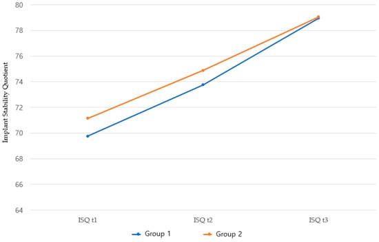 The comparison of the mean ISQs between group 1 and 2 implants at three time points (implant placement date, 1 month post-surgery, and 2–3 months post-surgery) showed no statistically significant difference at any time point. Both implants showed significant increases in the ISQs over time (Table 3, Figure 1).