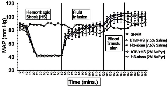 Effect of sodium pyruvate infusion on mean arterial pressure (MAP) in rats with combined blast injury and HS. Data represents mean ± SE of 8 animals in each group. All rodents had similar MAP at the baseline level and HS periods of the experiment. During the HS, the MAP was maintained within 40 s as intended. Both fluids increased MAP towards the baseline after infusion.