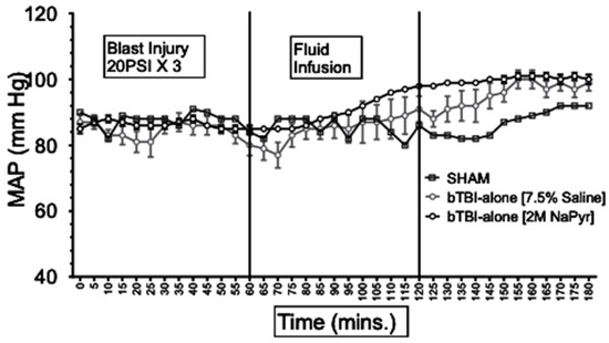 - Treatment groups (n = 16, divided into two subgroups): rats in this group were exposed to the same injury conditions (blast with or without HS) and were resuscitated with sodium pyruvate administered at 5 mL/kg/h.