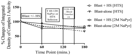 In our study, the significantly decreased activity in complex I from the baseline value was observed after the injury (T60), especially more in the combined injury with 20 PSI blast + HS animals. The mitochondrial complex I enzyme activity did not deteriorate further after both sodium pyruvate and hypertonic saline infusion. In addition, pyruvate treatment significantly reduced the plasma lactate levels indicating the protective mechanism of pyruvate through mitochondrial mechanisms in blast exposure as well as in combined injury.