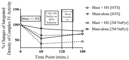 Complex IV in whole blood at different time points of 20PSI blast +/− HS injury, and 2 M NaPyr treated groups (n = 8) surviving for 4 h. A trend of decreased activity in complex IV from the baseline value was observed after the injury (T60), especially more in the 20 PSI-bTBI + HS animals. There were no statistically significant differences between the injury or treatment groups at different time points. Sodium pyruvate or control hypertonic saline infusion slightly improved or stopped further deterioration of the complex IV activity after the blast injury +/− HS.