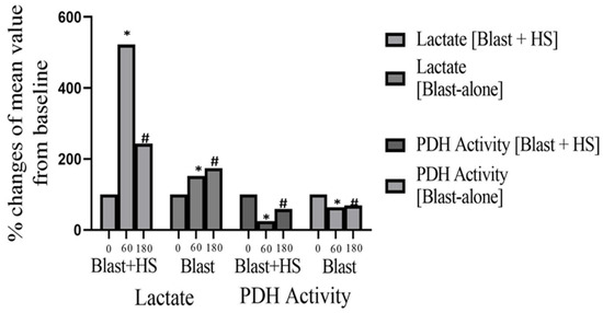 Comparison of plasma lactate and PDH activity at different time points of 20PSI blast +/− HS injury, and 2 M NaPyr treated animals (n = 8) surviving for 4 h. A trend of decreased activity in PDH, and increased concentration of plasma lactate from the baseline value was observed after the injury (T60), especially more and statistically significant (p < 0.001) in the 20 PSI-bTBI + HS animals. So, the PDH activity was inversely proportional to the plasma lactate concentration after the injury. Sodium pyruvate infusion had positive effects or improved the situation after the blast injury +/− HS. Symbol “*” denotes significant difference from T0 to T60, and “#” denotes significant difference from T60 to T180.