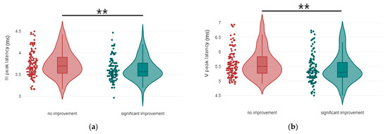 Violin plots of ABR latency components by treatment response: (a) III Peak latency, with significance indicated by asterisks (** p-value < 0.01); (b) V Peak latency, with significance indicated by asterisks (** p-value < 0.01).