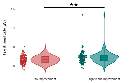 Violin plots of ABR amplitude components by treatment response. III Peak amplitude is shown, with significance indicated by asterisks (** p-value < 0.01).