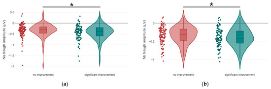Violin plots of AMLR amplitude components by treatment response: (a) Na trough amplitude, with significance indicated by asterisks (* p-value < 0.05); (b) Nb trough amplitude, with significance indicated by asterisks (* p-value < 0.05).