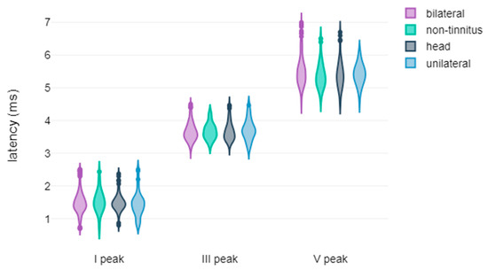 Violin plots of ABR waveform latencies based on tinnitus laterality.