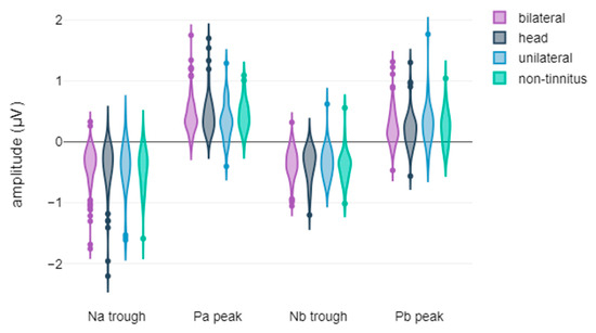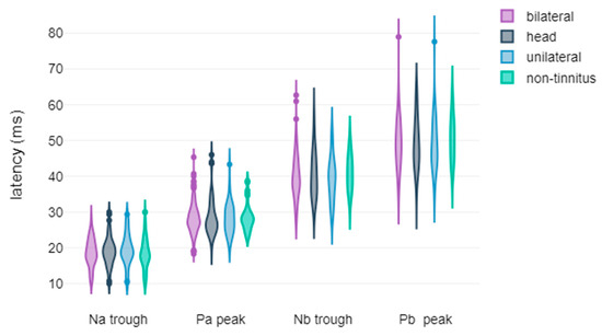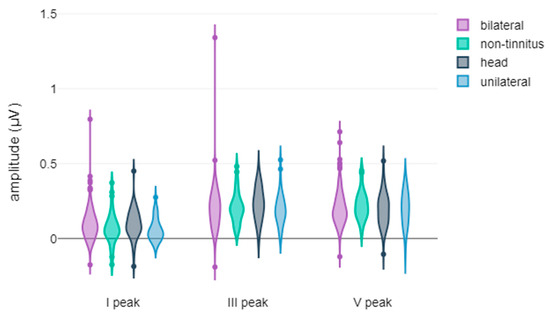 Figure 4, Figure 5, Figure 6 and Figure 7 illustrate violin plots representing the latencies and amplitudes of ABR and AMLR waveforms categorised by tinnitus localisation. Nevertheless, it is noteworthy that for both types of waveforms, our analysis did not reveal any statistically significant differences among the compared groups in any of the measured metrics.