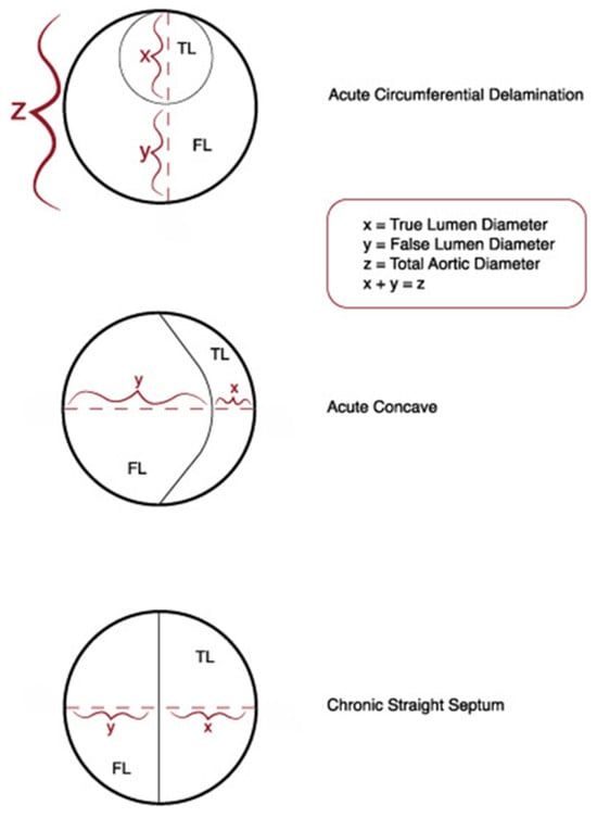 - Tolenaar, J.L.; Eagle, K.A.; Jonker, F.H.W.; Moll, F.L.; Elefteriades, J.A.; Trimarchi, S. Partial thrombosis of the false lumen influences aortic growth in type B dissection. Ann. Cardiothorac. Surg. 2014, 3, 275–277. [Google Scholar] [CrossRef]