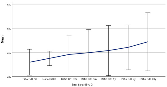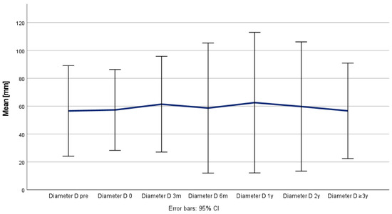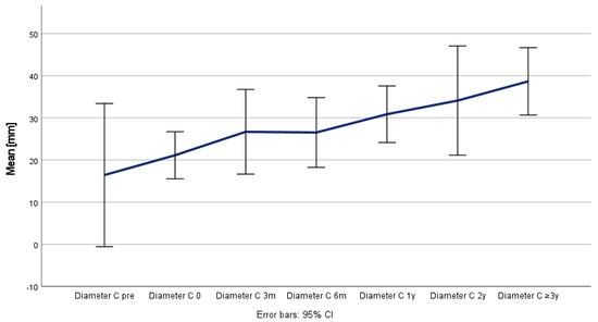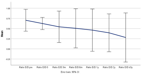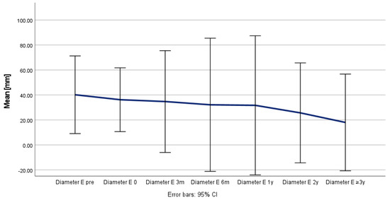 Positive aortic remodeling was observed in all the patients, although the maximum thoracic aortic diameter (Z) remained stable (p = 0.526), as the true lumen (X) increased from 22 to 33 mm (p = 0.009) and the false lumen (Y) decreased from 41 to 20 mm (p = 0.076) during the follow-up period (Table 4 and Figure 4, Figure 5 and Figure 6) and was confirmed in the corresponding ratio results between the true lumen, false lumen, and total aortic diameter (Table 5 and Figure 7 and Figure 8).