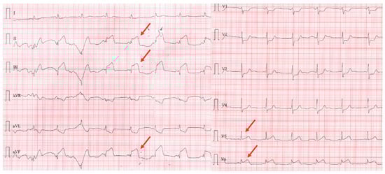 Electrocardiogram with postero-infero-lateral ST segment elevation myocardial infarction (the red arrows).