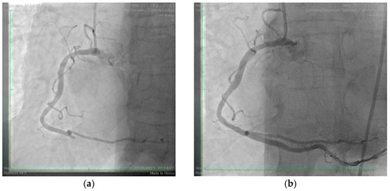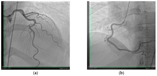 Coronary angiography with non-obstructive coronary arteries. (a) Normal left coronary arteries; (b) normal right coronary artery.