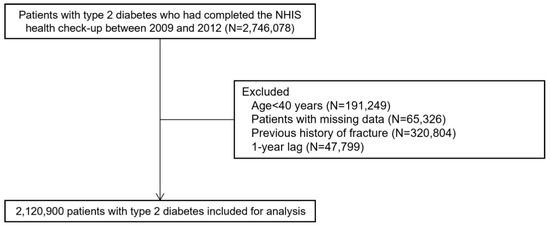 Ultimately, 2,120,900 patients with T2DM were included in the analysis. Patients were followed up from baseline (i.e., date of the first health checkup between 1 January 2009 and 31 December 2012) to the date of incident fractures or 31 December 2019, whichever came first.