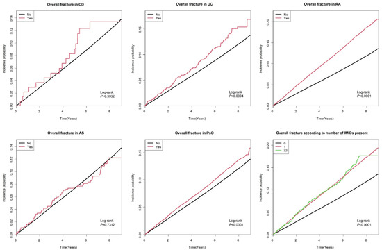 Cumulative incidence of overall fractures according to the presence of each IMID and the number of comorbid IMIDs. CD, Crohn’s disease; UC, ulcerative colitis; RA, rheumatoid arthritis; AS, ankylosing spondylitis; PsO, psoriasis; IMIDs, immune-mediated inflammatory disease.