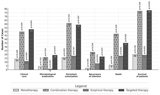Differences in the primary and secondary outcomes between different subgroups are reported in Figure 1 and Figure 2. No statistically significant differences in effectiveness were observed among patients treated with monotherapy or combination therapy as well as among patients treated with high or standard dose daily regimens. Patients receiving a targeted therapy presented a higher microbiological eradication than those receiving empirical therapy (16.8% vs. 2.7%, p = 0.027). Patients treated with inhaled and intravenous therapy had a higher proportion of clinical cure outcomes than those with intravenous therapy alone (57.4% vs. 37.0%; p = 0.028).