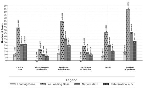 Comparison of outcomes: use or non-use of the colistin loading dose and route of administration—intravenously or nebulization with intravenous infusion. The analysis was performed with the chi-square test or Fisher’s exact test.