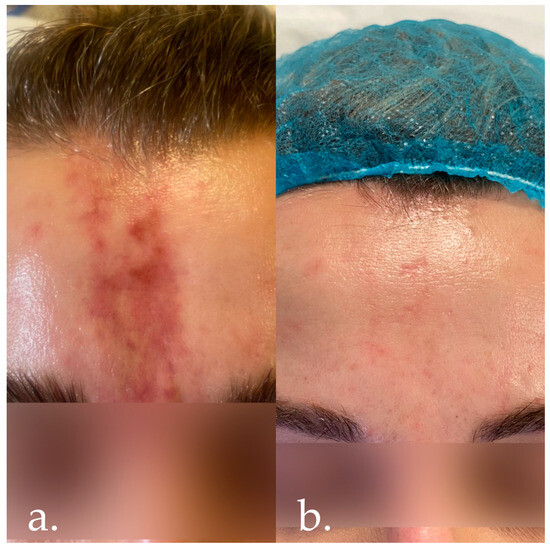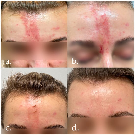 Some 2–3 months after the end of the pharmacological treatment, a series of three autologous platelet-rich plasma treatments were performed in combination with free hyaluronic acid, vitamins, and minerals (Fillmed NCTF 135 HA, LABORATORIES FILLMED, Paris, France) and two series of laser therapy using Dye-VL technology, thus achieving a satisfactorily aesthetic result (Figure 2d and Figure 3b).