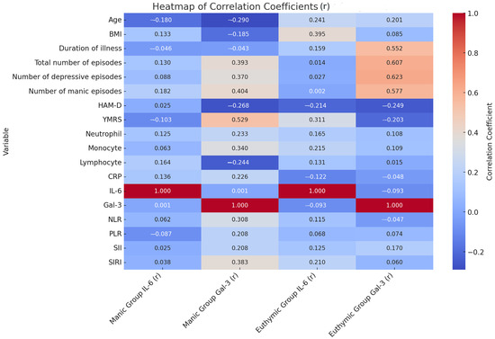 Relationship between clinical data of patients and hemogram and biochemical parameters. r: correlation coefficient; BMI: Body Mass Index; CRP: C-Reactive Protein; Gal-3: Galectin-3; HAM-D: Hamilton Depression Rating Scale; IL-6: Interleukin-6; NLR: Neutrophil/Lymphocyte Ratio; PLR: Platelet/Lymphocyte Ratio; SII: Systemic Immune Inflammation Index; SIRI: Systemic Inflammatory Response Index; YMRS: Young Mania Rating Scale.