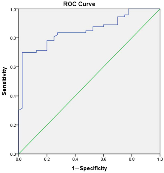 ROC curve analysis for Galectin-3 (Patient group–Control group). Galectin-3 cut off value (Patient group–Control group): 829.58, sensitivity 78.1%, specificity 80%.