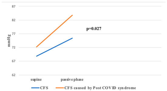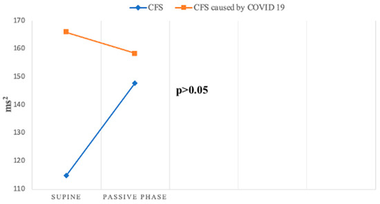 Beat-to-beat analysis showed that spectral parameters of heart rate variability (HRV) in the supine position were significantly lower in both groups compared to the control group, indicating reduced activity in both sympathetic and parasympathetic components of the ANS. These findings align with the work of Ryabkov et al., who also observed reduced HRV parameters in patients with CFS and post-COVID-19 syndrome [30]. During the passive phase of the HUTT, there was a different pattern of HF—RRI changes during the passive phase between two groups (Figure 7).