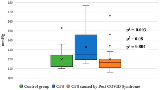 Systolic blood pressure at night between groups. p1—p value for comparison between control group and Group 1; p2—p value for comparison between control group and Group 2; p3—p value for comparison between Group 1 and Group 2.