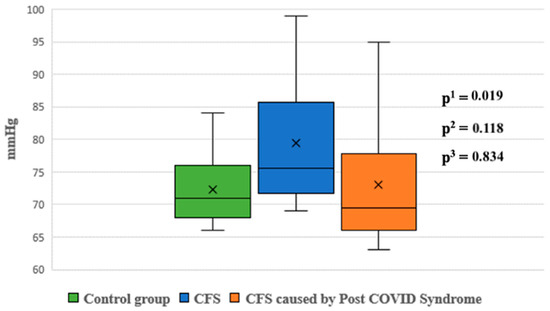 Diastolic blood pressure at night between groups. p1—p value for comparison between control group and Group 1; p2—p value for comparison between control group and Group 2; p3—p value for comparison between Group 1 and Group 2.