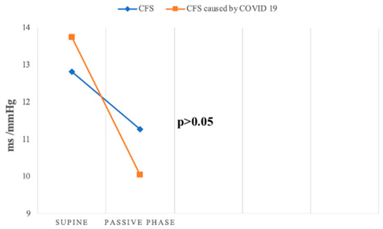 Baroreceptor reflex sensitivity (BRS) and the baroreceptor effectiveness index (BEI) were lower in both groups compared to the control group, indicating impaired baroreceptor function, a crucial mechanism for short-term blood pressure regulation. Both parameters decreased further during the passive phase of the HUTT in Groups 1 and 2. Peckerman et al. similarly observed a reduction in BRS during HUTT in patients with severe CFS [32]. Although BRS and BEI values were higher in the supine position in Group 2 compared to Group 1, they decreased more significantly during the passive phase in Group 2, highlighting greater baroreceptor impairment in this group (Figure 8).