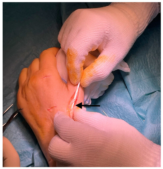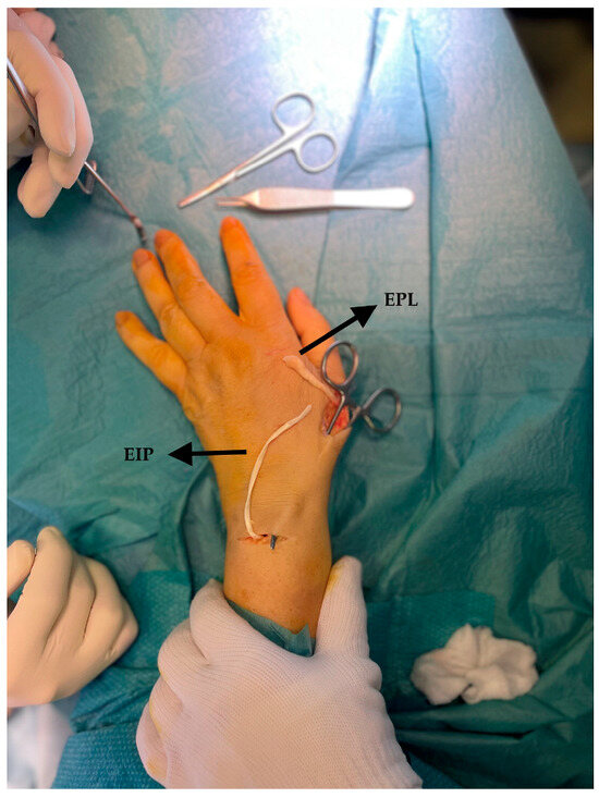 All procedures were performed under brachial plexus anesthesia by the same surgeon. The tourniquet was applied in all procedures before incision and removed before wound closure. In this technique, only three small incisions are needed to expose the EIP [28,29,30,31,32]: (1) a smaller transverse incision on the head of the second metacarpal bone (MC) to isolate the EIP, which is located ulnarly to the Extensor Index Digitorum Communis (EICD). It is dissected and brought out of the first incision while the distal stump is sutured to the extensor cuff. (2) A second transverse incision was made at the base of the second MC to follow the course of the tendon and keep it taut for the third incision. (3) A transverse incision, distal to the Lister’s tubercle, is performed. At this point, the distal head of the EIP is dislocated subcutaneously, emerging from the last incision made (Figure 1).
