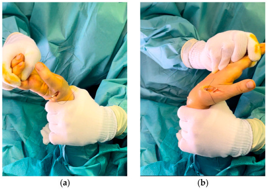 Before completing the tenorrhaphy, dynamic intraoperatively tests are performed to verify the tightness and sufficient rigidity of the suture: while the wrist is kept in a radial position, extending it will cause flexion of the IP and MC-P of the thumb (Figure 4a), while, when the wrist is flexed, these joints must extend (Figure 4b). It may be useful to use temporary stitches to perform dynamic maneuvers and to possibly remove and reposition them until the tension and excursion are satisfactory. Finally, the tendon stump is re-tied to close the loop, and some stitches are placed with Nylon 3/0 and 4/0 to complete the tenorrhaphy. Lastly, after removing the tourniquet, careful hemostasis, abundant washing, and suturing conclude the operation (Figure 5).
