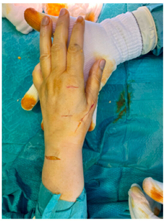 - Cristophe, K. Rupture of the extensor pollicis longus tendon following Colles’ fracture. J. Bone Jt. Surg. 1953, 35, 1003–1009. [Google Scholar] [CrossRef]
