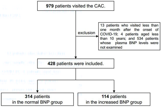 In this study, we reviewed the medical records of all patients who visited the CAC from February 2021 to April 2024. We defined long COVID as “persistence of several symptoms for more than one month after the onset of COVID-19” [,]. A diagnostic test confirming SARS-CoV-2 infection was not required as evidence of infection []. We included patients aged 10 years or older due to ethical considerations such as the difficulty in obtaining informed consent from patients younger than 10 years of age. Among the 979 patients who visited the CAC during that period, 13 patients who presented within one month of COVID-19 onset and 4 patients under the age of 10 years were excluded from the analysis. After excluding 534 patients who did not have their plasma BNP levels examined, the remaining 428 patients with long COVID were included in the present study (Figure 1).