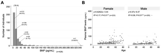 In the present study, we investigated the relationships between long COVID symptoms and concentrations of plasma BNP. Plasma BNP levels were higher than 18.4 pg/mL in 114 (26.6%) of the patients. In the present study, the plasma BNP concentrations tended to increase with age, particularly in females. Since BNP levels have been shown to be generally elevated in males in a Japanese cohort [], there might be some other reasons why the plasma BNP levels were elevated especially in elderly female patients in the present study.