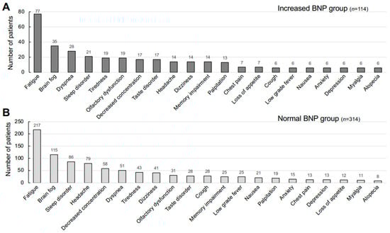 Clinical symptoms complained by the long COVID patients with or without increased plasma BNP levels. Frequent symptoms in 114 patients in the increased BNP group (A) and those in 314 patients in the normal BNP group (B) were graphed.
