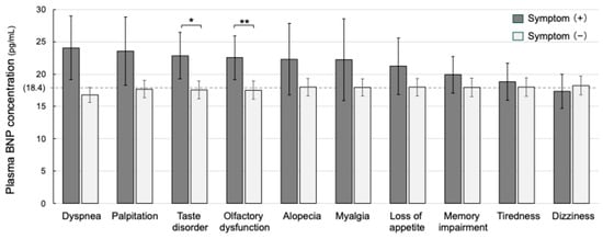 The number of individuals complaining of each symptom in the two groups is shown in Figure 3. Fatigue and brain fog were the most common symptoms in both groups, while dyspnea was the third most frequent symptom only in the increased BNP group. Olfactory dysfunction and taste disorders were also common symptoms in the increased BNP group. As shown in Figure 4, a comparison of the average BNP levels by the presence of these symptoms in all of the patients showed that patients with taste disorders and olfactory dysfunction had significantly higher BNP levels than those in patients without these symptoms (22.9 pg/mL vs. 17.6 pg/mL; p < 0.05 and 22.5 pg/mL vs. 17.5 pg/mL p < 0.01, respectively). Although the patients with dyspnea and patients with palpitations also had much higher average BNP levels (23 to 24 pg/mL) than those in patients without these symptoms, the differences were not statistically significant. Other symptoms that were associated with relatively high average BNP levels were dyspnea (24.1 pg/mL), palpitation (23.6 pg/mL), alopecia (22.3 pg/mL), myalgia (22.2 pg/mL), loss of appetite (22.2 pg/mL), memory impairment (19.9 pg/mL), and tiredness (18.8 pg/mL) (Figure 4).