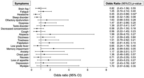Symptoms related to the increase in plasma BNP levels in the patients with long COVID. A logistic regression analysis was performed, and the odds ratios related to increases in plasma BNP levels were evaluated for each major symptom of long COVID. The differences were considered statistically significant at * p < 0.05. CI: confidence interval.