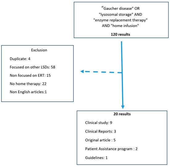A search of the literature was conducted in Pubmed/Medline database, Cochrane Review and Google Scholar with Windows version 0.24121.37.0, No entry date was set, and the search was revised in November 2024. The keywords used were as follows: ((“Gaucher Disease”[Mesh]) OR Gaucher Disease, OR (“lysosomal storage”[Mesh])) OR lysosomal storage AND (“enzyme replacement therapy”[Mesh]) OR Enzyme replacement Therapy AND “Home therapy” [Mesh] OR Home therapy to extract original studies, expert opinions, guidelines, and reports published in international journals. This investigation was conducted by two assessors. One hundred twenty results were retrieved. Extracted publications were screened for relevance and duplication. Studies discussing patients with LSDs other than type 1 GD, non-enzymatic home therapy, or non-English articles were excluded. Twenty relevant articles were then analyzed (Figure 1).
