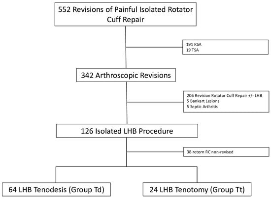 A total of 126 patients underwent an isolated LHB procedure. However, intraoperatively, 38 patients showed evidence of a small retorn RC which was not repaired and were therefore excluded. A total of 88 patients were then included in this study, undergoing an isolated tenotomy or tenodesis of the LHB associated with a subacromial bursectomy.