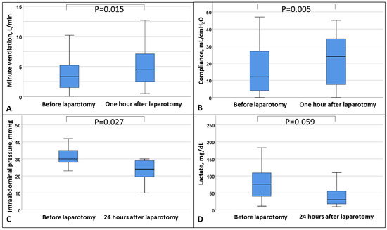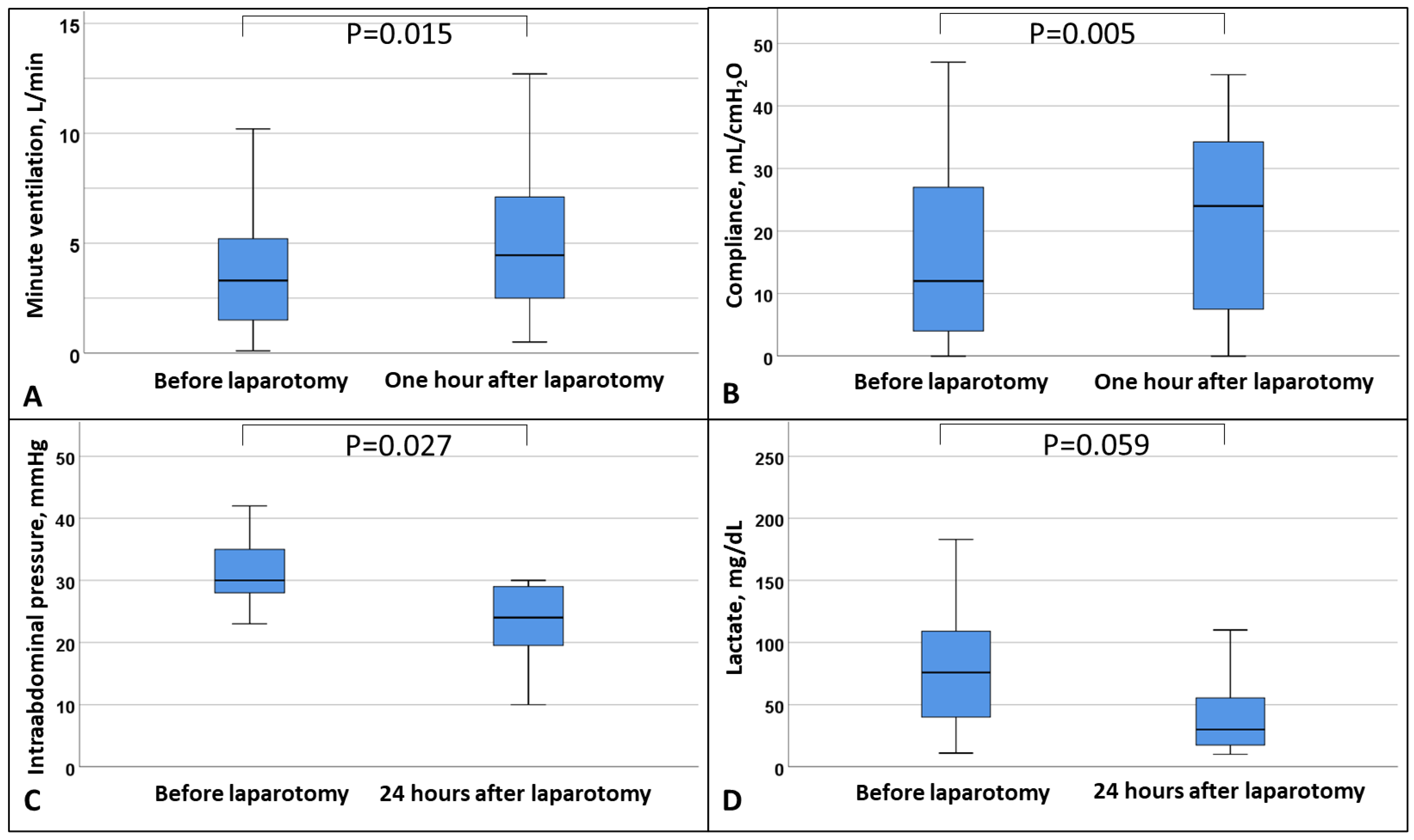 Box plot of (A) minute ventilation, (B) respiratory system compliance, (C) intra-abdominal pressure, and (D) lactate before and after decompressive laparotomy. Data are expressed as median, minimum, maximum, 25. percentile, and 75. percentile.