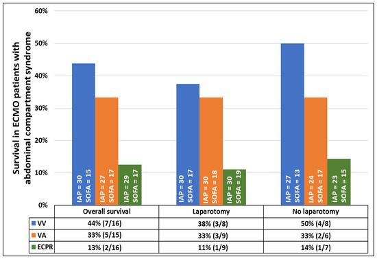 Survival rate of patients with abdominal compartment syndrome requiring veno-venous or veno-arterial extracorporeal membrane oxygenation, or extracorporeal cardiopulmonary resuscitation according to decompressive laparotomy. Data are presented in percentages. Intra-abdominal pressure and sequential organ failure assessment are presented as median values. All p-values comparing survival rates within each group of patients with and without decompressive laparotomy are >0.05.